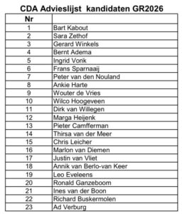 De eerste twaalf kandidaten vormen het campagneteam. Opvallend is dat huidig fractievoorzitter Dirk van Willegen als lijstduwer op plek 11 staat om ruimte te geven aan nieuwe kandidaten. Tijdens de avond presenteerde de partij ook de nieuwe slogan: “Vertrouwd Dichtbij”, waarmee het CDA wil benadrukken zichtbaar te zijn in de lokale samenleving. Campagneleider Bernt Adema noemt de slogan passend bij het nieuwe team.