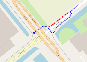 Ook fietsers kunnen de kruising oversteken, onder begeleiding van de verkeersregelaars. Zij worden verwezen naar een korte omleiding via de Hoofdweg.