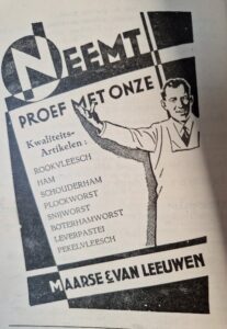 Via omzwervingen kreeg ik het ‘Officieel Feestprogramma‘ in handen van de Aalsmeerse Koorvereniging en het Aalsmeers Fanfarecorps juli 1939! De oorlog was nog ver weg en alle ruimte voor feestelijkheden. Het programmaboekje kostte 15 cent, geen geld voor een avondje advertentievermaak en wat een programma! Twee weekenden vol muziek! Neem nou deze advertentie van Maarse en van Leeuwen, je zou er trek van krijgen. Consumptietarieven van J. Smit, Stationsweg 3 in de ‘groote Consumptie Danstent’. Voorbeeld: Broodje met ham 25 cent. Heele uitsmijter rosbief 75 cent.